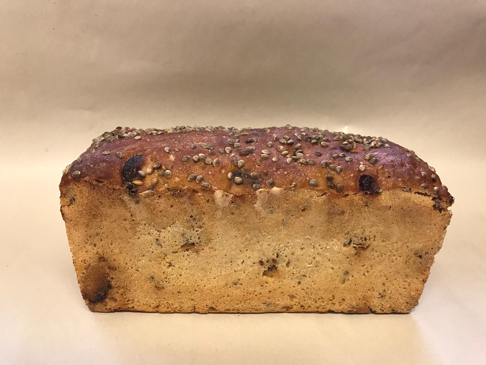 Farine de blé ancien T65, eau, sel, levain, sucre, dattes, fleur d’oranger, graine de chanvre