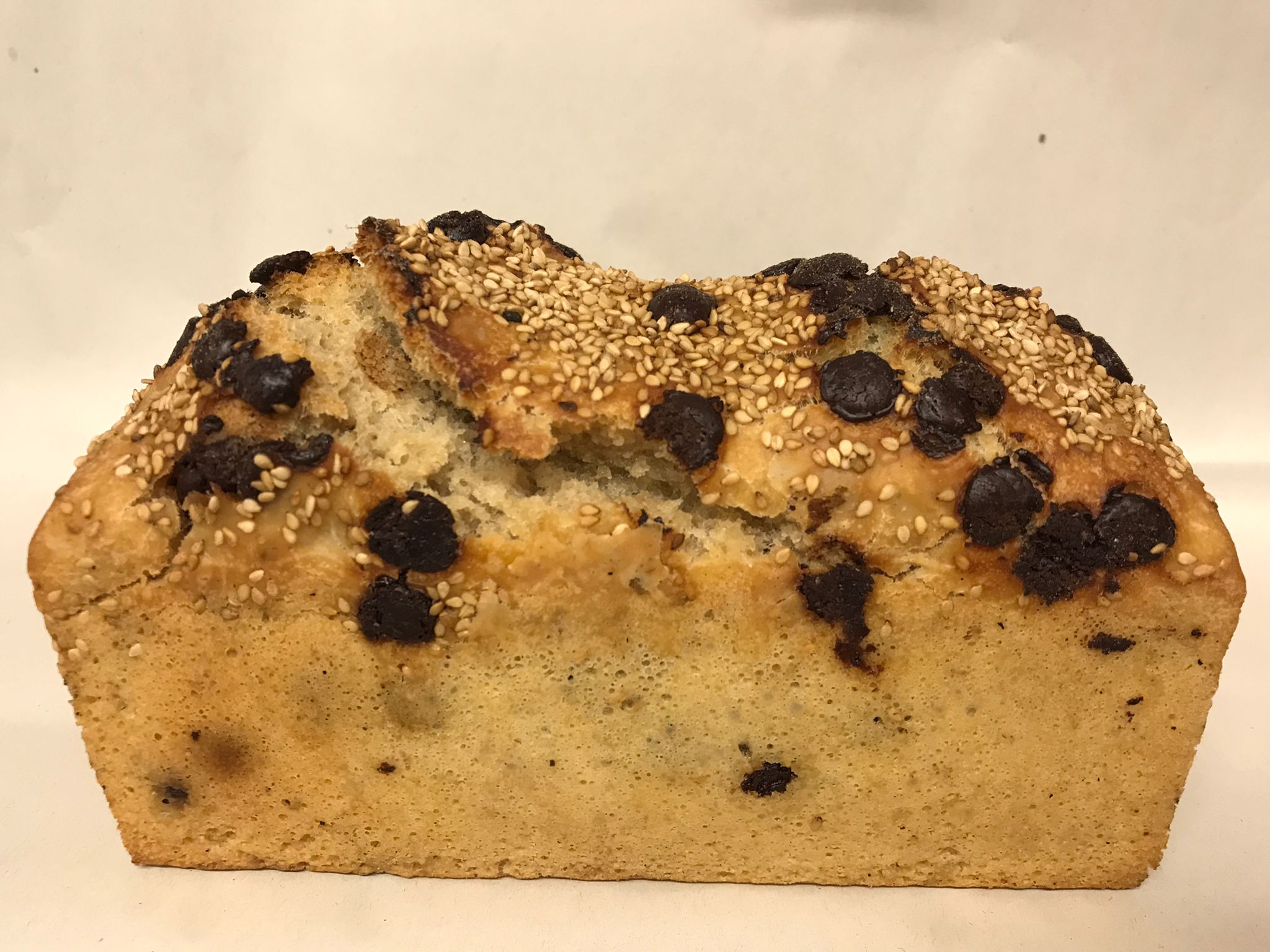 Blé ancien T65, eau, sel, levain de son, huile d’olive, sucre, pépites de chocolat, sésame